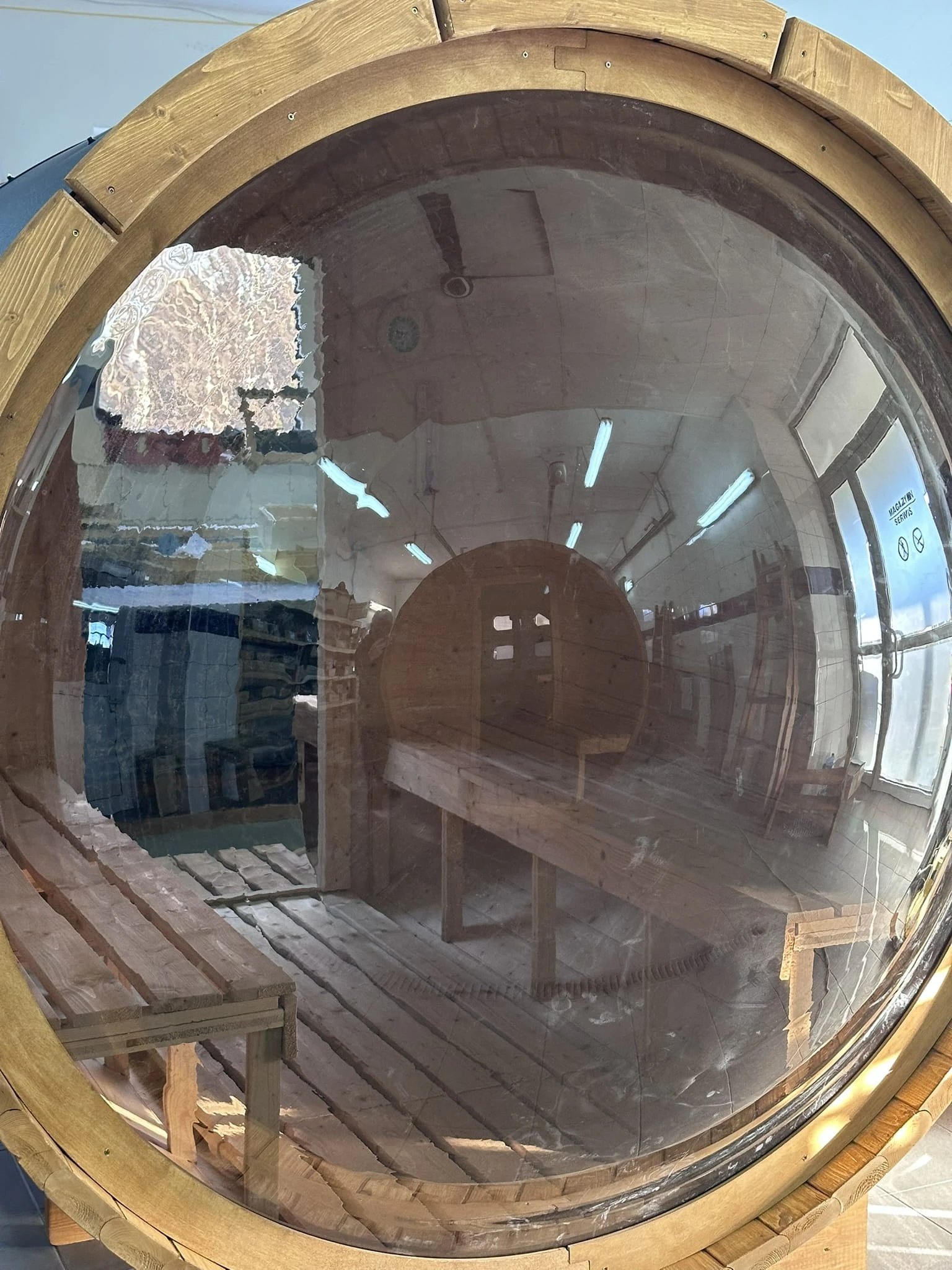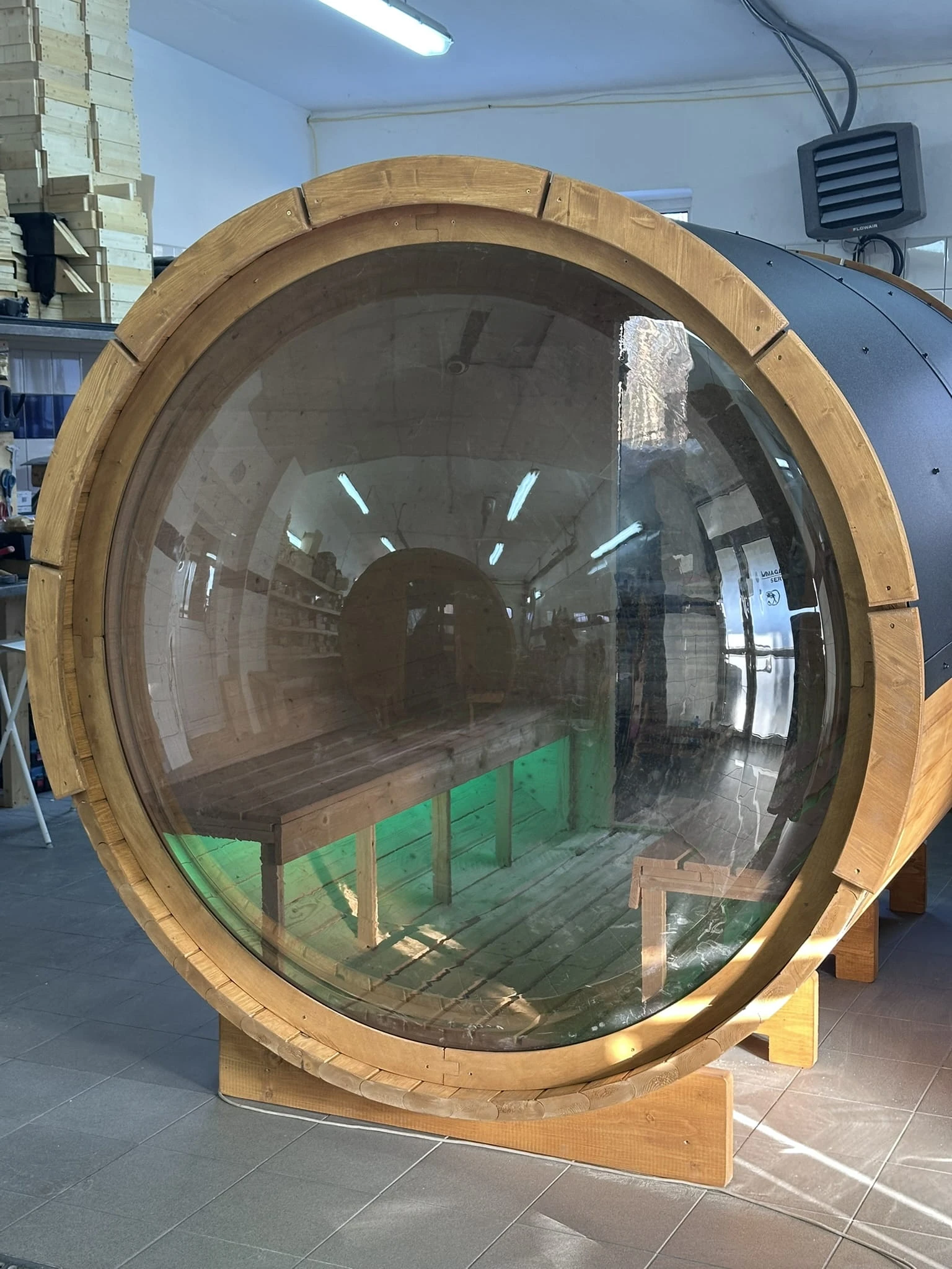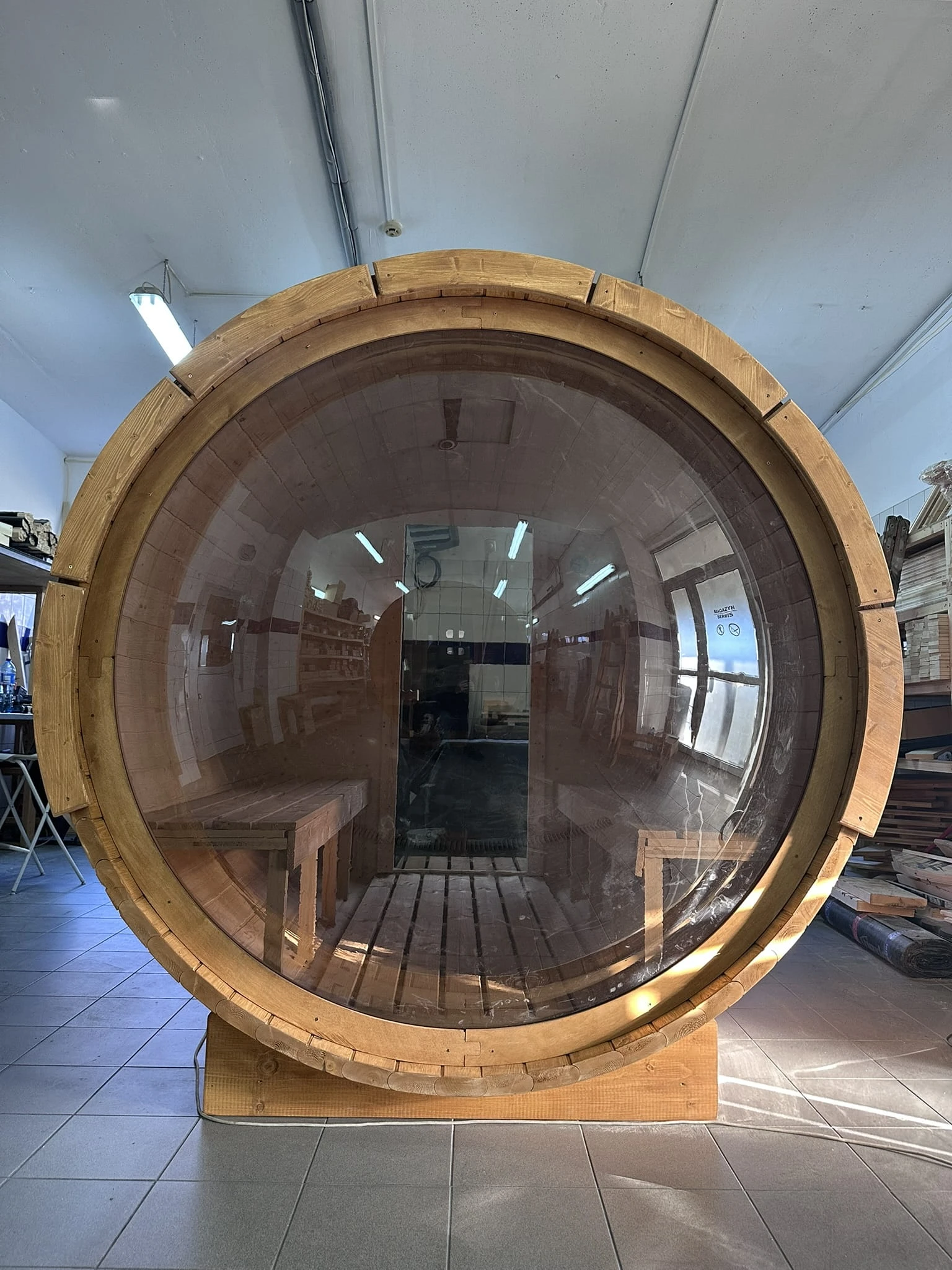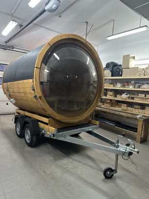 - Fahrfertige Version: Sauna montiert auf Anhänger, bereit zur Auslieferung.
