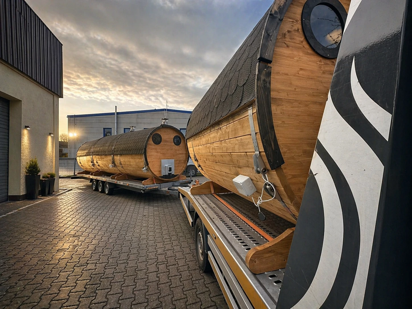 - Anlieferung: Die Sauna wird komplett montiert auf einem Anhänger oder Transportfahrzeug geliefert