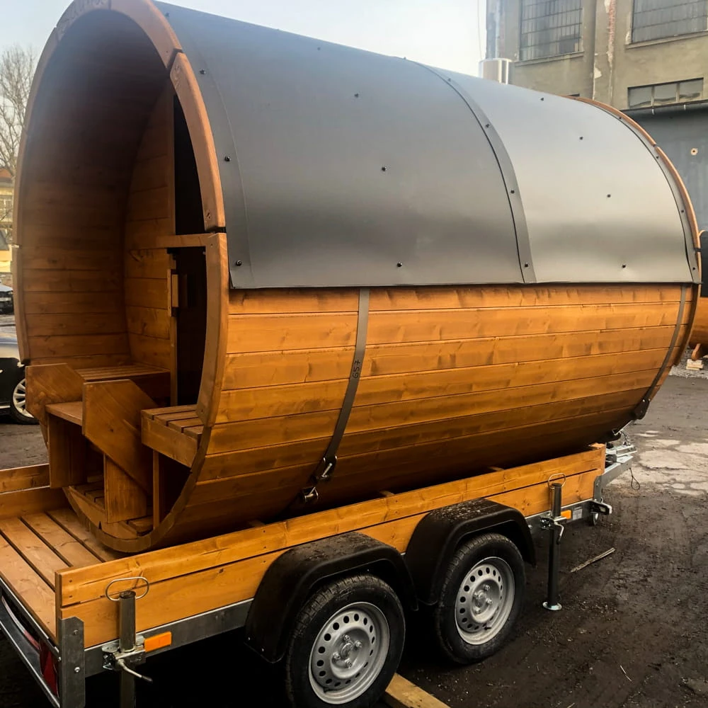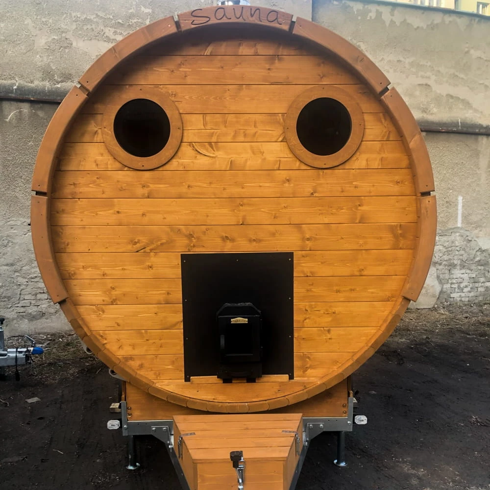 Dieses Modell verbindet klassisches Fasssauna-Design mit praktischer Mobilität. Die Sauna wird auf einem Anhänger montiert und kann dadurch leicht transportiert und an verschiedenen Orten genutzt werden. Das macht sie besonders interessant für Privatkunden, Ferienhäuser, Eventbereiche und Vermietung.