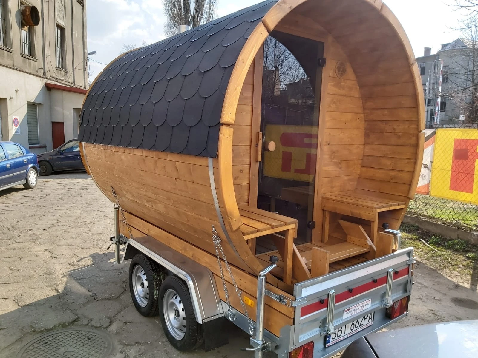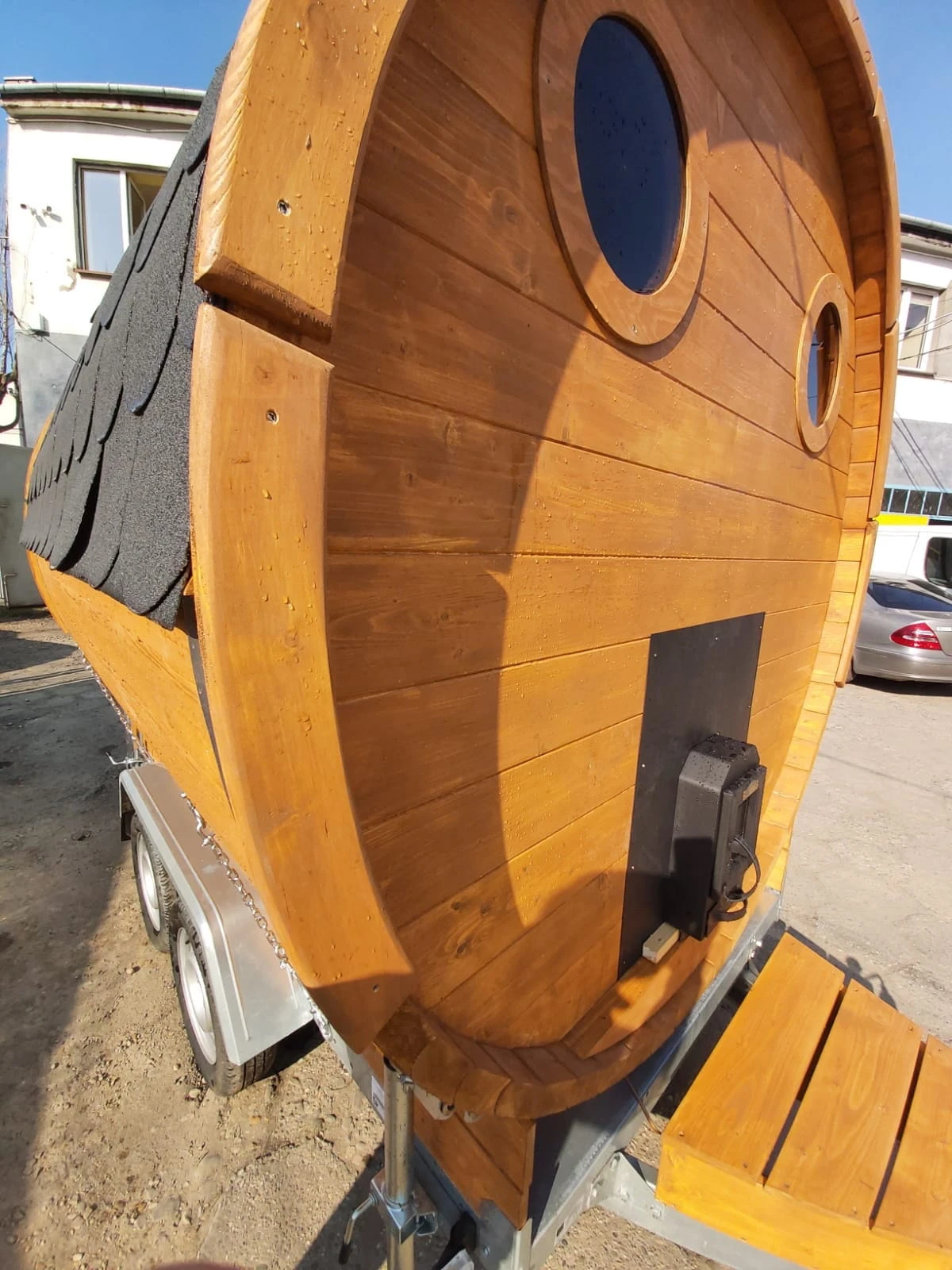 - Typ: mobile Fasssauna mit Anhänger