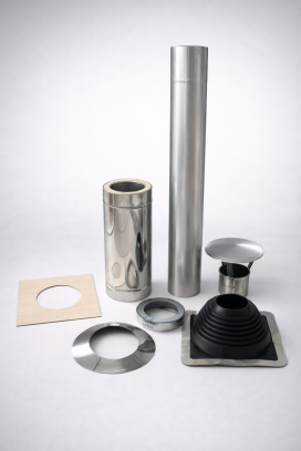 Es enthält die wichtigsten Komponenten für eine sichere, saubere und optisch passende Abgasführung durch das Dach.