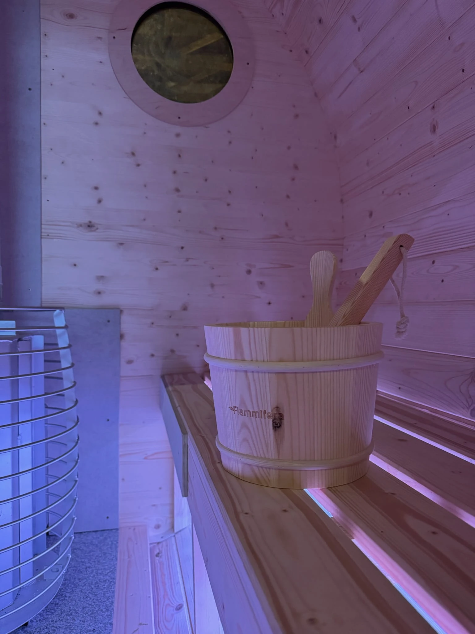 - Runde Fassform: schnelle Aufheizzeit, effiziente Luftzirkulation und angenehm gleichmäßige Wärme.