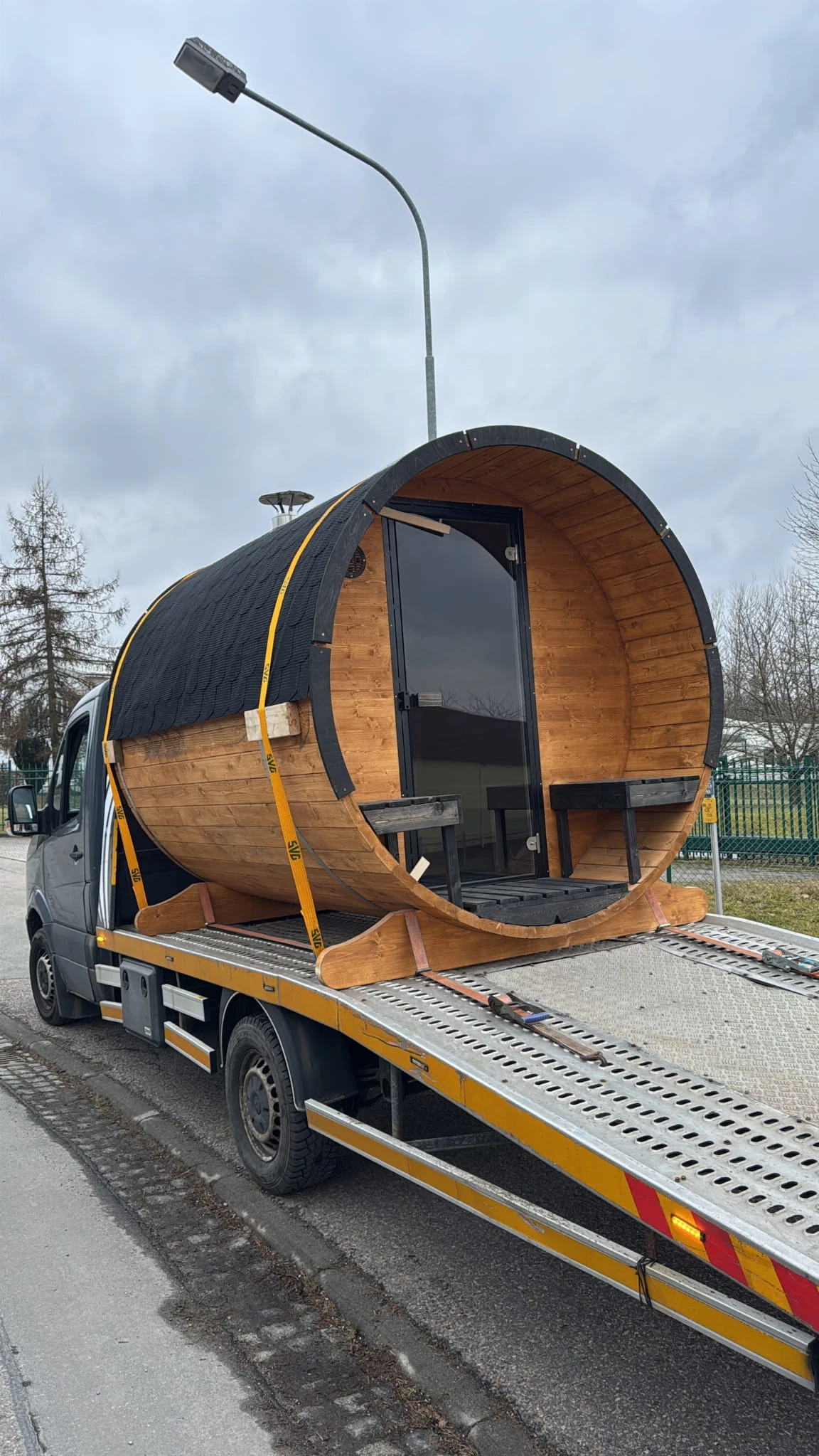 - Anlieferung: die Sauna wird fix und fertig montiert auf einem Anhänger / Transportfahrzeug geliefert.